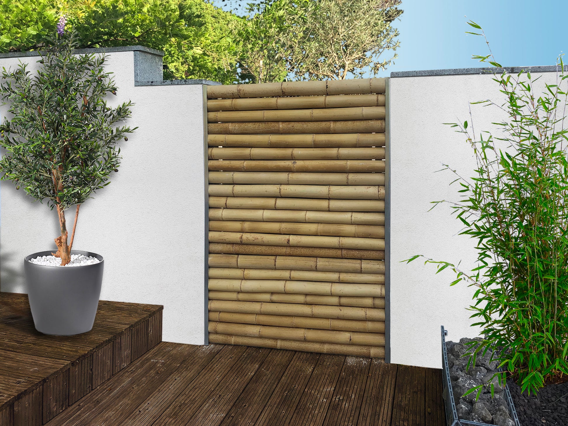 Bambusrohre verfügen über einen natürlichen Witterungsschutz, der jedoch mit der Zeit durch äußere Einflüsse vergeht. Niederschläge und Sonneneinstrahlungen führen zu Verwitterung und Verfärbungen. Eine regelmäßige Pflege mit Bambus-Schutzölen bietet einen UV-Schutz und macht den Bambus wasserabweisend. Wir empfehlen einen baulichen Witterungsschutz und das Vermeiden von stetigem Erd-/Wasserkontakt um die Einflüsse zu minimieren.